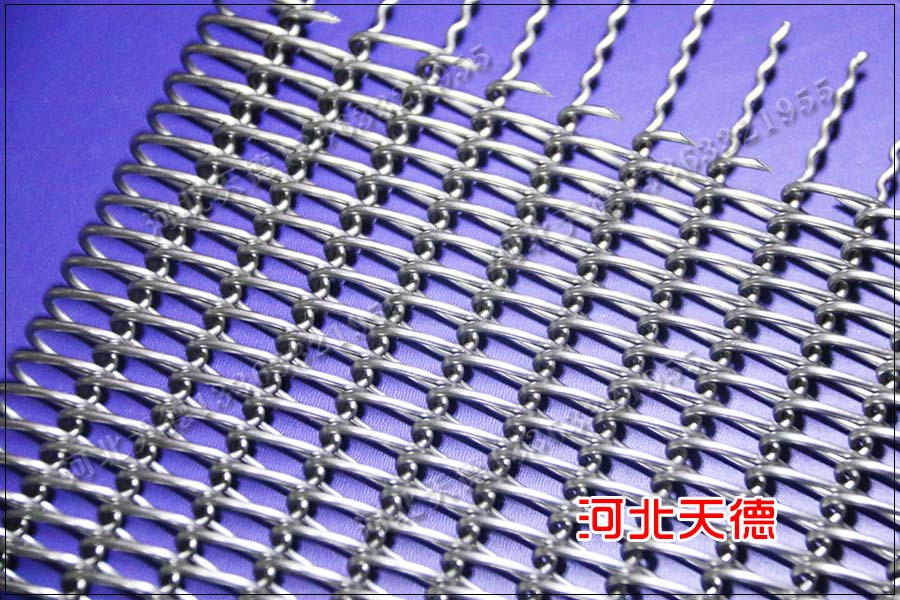 根據(jù)每米輸送帶上面的載重絲徑定制為:2毫米,鋼絲編織的孔為15*30毫米。