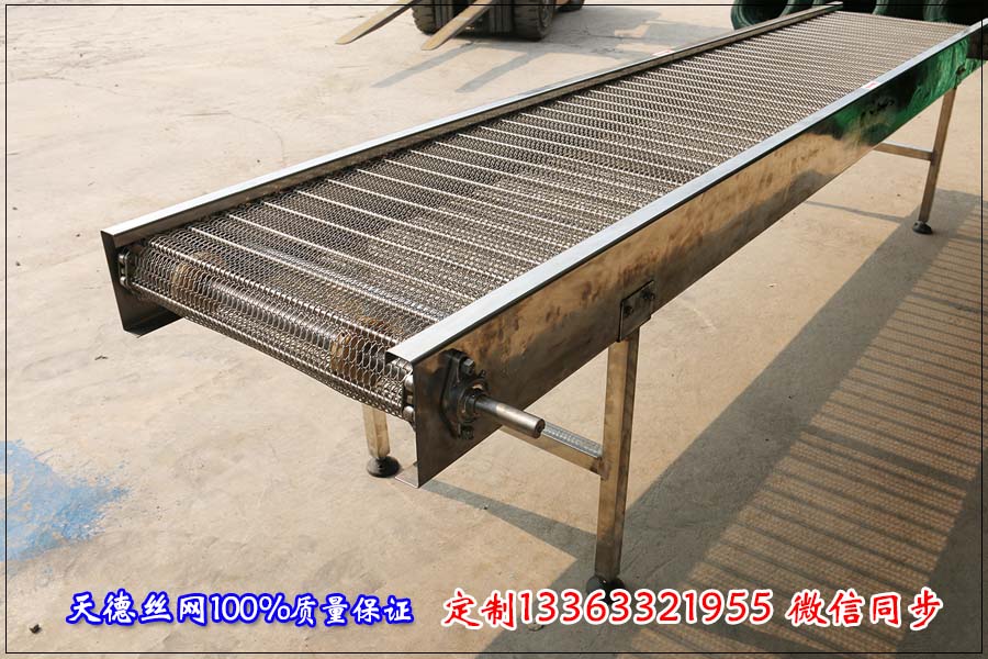 天德絲網(wǎng)生產(chǎn)金屬網(wǎng)帶輸送 機(jī),鏈板輸送機(jī),網(wǎng)鏈輸送機(jī),長(zhǎng)城網(wǎng)帶輸送機(jī)等流水線(xiàn)輸送設(shè)備 ,下面介紹以下網(wǎng)帶輸送機(jī)的特點(diǎn): 金屬網(wǎng)帶輸送機(jī)采用不銹鋼網(wǎng)帶作為輸送載體,驅(qū)動(dòng)方式有減速電機(jī)驅(qū)動(dòng),調(diào) 速方式有變頻調(diào)速。機(jī)身材質(zhì)有不銹鋼、碳鋼、鍍鋅板等。網(wǎng)帶輸送機(jī)適用于各行業(yè)烘干、去濕、降溫、清洗、速凍等工藝。