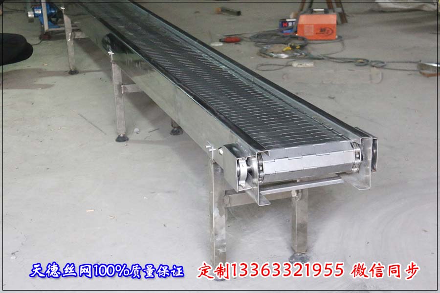 名稱:鏈板輸送機 材質:碳鋼 規格:長2.5米,使用寬度200mm 機身板厚2mm 鏈板:節距38.1mm 板厚1.5mm 串桿6mm 刮板高20mm 間隔300mm一個 。