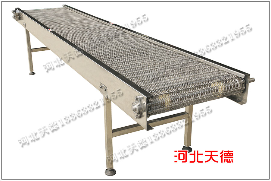山西陽(yáng)泉客戶定制的不銹鋼網(wǎng)帶輸送機(jī),這臺(tái)輸送機(jī)用于高溫中使用,因此整機(jī)采用不銹鋼304材質(zhì),輸送機(jī)長(zhǎng)度5米,總寬度650毫米,高度大概半米,采用1.5千瓦電機(jī),配電減速機(jī)變頻器。